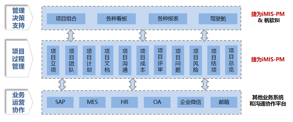 东江集团管理决策层高度重视企业数字化建设,通过实施erp、mes、oa、hr、bi和企业微信等众多信息化系统,以达到规范管理流程、提高运营效率、降低管理成本、提高客户满意度,增强核心竞争力的目的。作为公司核心业务构成的pms项目管理系统,东江选择的是捷为imis-pm系统,在整个it系统架构中居于中间和偏上的位置。一方面,pms系统拉通项目业务全过程,并与核心的业务运营系统和邮件、企业微信等无缝集成,形成业务流程的高速运转和项目执行的高效协同,另一方面,pms系统提供各类管理看板/报表,为各层级管理者提供决策支持。